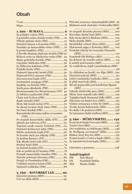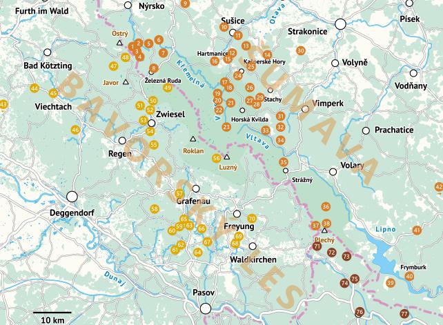 Podrobný místopisný průvodce Šumavou, Bavorským lesem a Mühlviertelem. Abecedně řazený popis místopis 550 obcí (i dnes neexistujících), architektonických památek i přírodních a turistických zajímavostí se vzájemnými odkazy usnadní orientaci v krajině a plánování vycházek, tůr a cyklovýletů.