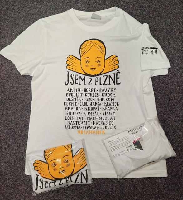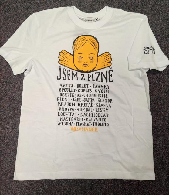 Tričko univerzálního střihu s potiskem vpředu a s výšivkou (logo Starý most) na levém rukávu. Vpředu je ilustrace z obálky knihy Plzeňsko-český slovník (rozšířené vydání), jejímž autorem je Václav Šlajch. Potisk byl vytvořen pomocí sítotisku. Můžete si tričko objednat rovnou i s knihou.