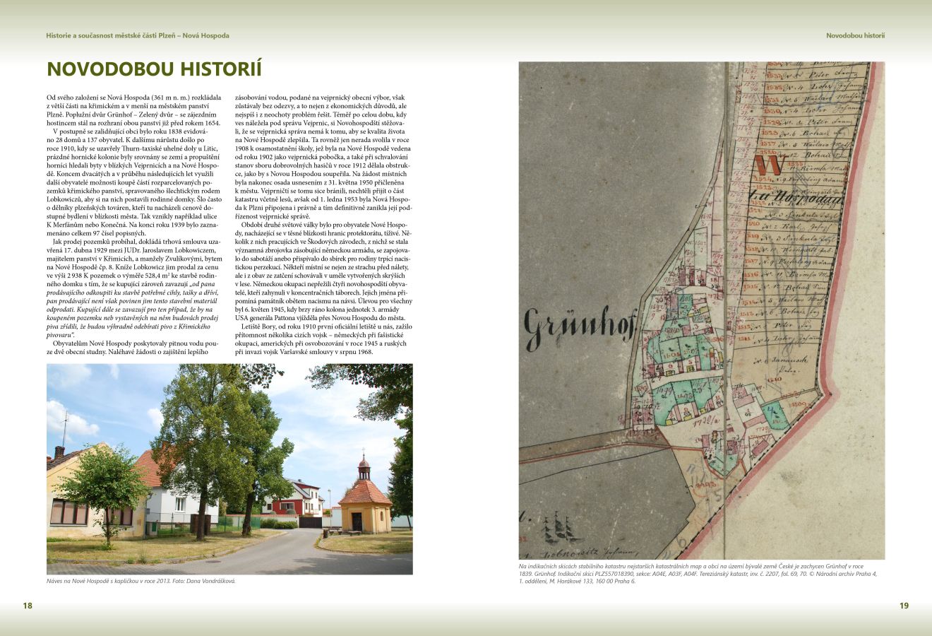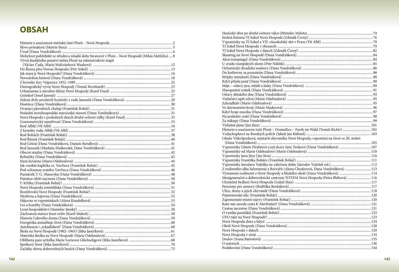 Kniha se uceleně zabývá historií městské části Plzeň – Nová Hospoda. Věnuje se nejen historickým faktům a událostem obce provázané s minulostí Plzně, ale rovněž dějinám každodennosti. Dotýká se demografie, sociologie, archeologie, geografie, antropologie či etnografie. Cenné poznatky doplňuje množství dobových a současných fotografií, dokumentů, starých tisků, archiválií včetně vzácných a unikátních map, poskytnutých ze soukromých i státních archivů a institucí.