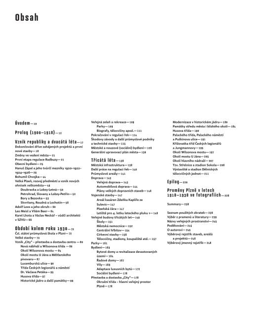 Kniha se zabývá stavebním vývojem Plzně v meziválečném období, je prvním komplexním zpracováním tohoto tématu. V publikaci je připomenuta velmi málo známá tvorba místních architektů, a to včetně německy hovořících a židovských. Překvapením budou práce mnohých slavných českých tvůrců, neboť jejich činnost pro Plzeň nebývá mnohdy v přehledech zmiňována. Unikátní je z velké části i obrazová část publikace.