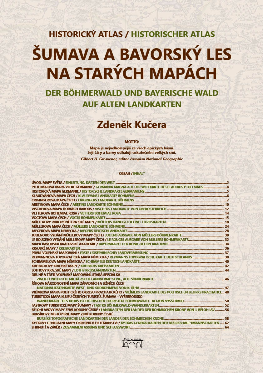 Unikátní velkoformátová publikace přináší výběr map od 16. do 20. století, na kterých je zachycena Šumava a Bavorský les. Kniha obsahuje regionální mapy včetně map vojenských, hospodářských či politických, mapové kuriozity a miniatury. Součástí je etymologie vybraných zeměpisných jmen Šumavy a Pošumaví (kopce, řeky a sídla) a jejich první výskyt na původních mapách Čech, i přehled vybraných zaniklých obcí. Texty v českém a německém jazyce. Autorem je Zdeněk Kučera.