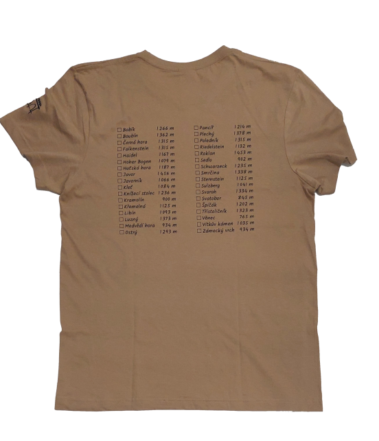 Tričko univerzálního střihu s potiskem vpředu a vzadu a s výšivkou (logo Starý most) na levém rukávu. Tričko je pískové barvy. Bílou variantu můžete koupit zde. Vpředu motiv z obálky knihy Kudy na šumavské vrcholy, jejímž autorem je Václav Šlajch. Vzadu přehled 34 šumavských vrcholů, kterým se kniha věnuje. K tričku je přiložen černý fix na textil, kterým můžete snadno označit zdolané vrcholy. Potisk byl vytvořen pomocí sítotisku.
