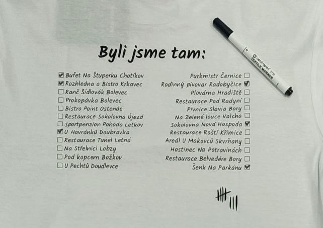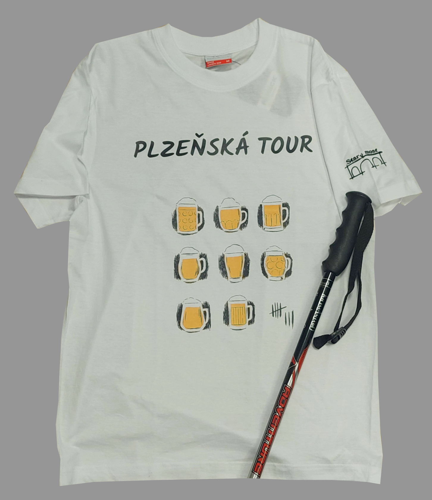 Tričko univerzálního střihu s potiskem vpředu a vzadu a s výšivkou (logo Starý most) na levém rukávu. Ideální plzeňské výletové tričko. Pokud při toulání městem a jeho okolím navštívíte vybrané restaurace a ke každé se vydáte z plzeňského náměstí, ujdete celkem 132 kilometrů. Autorem ilustrace je Václav Šlajch.